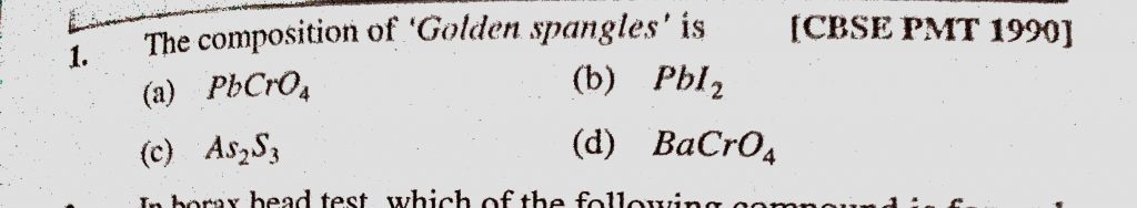 The composition of ‘Golden spangles’ is (a) PbCrO4 (b) PbI2 (c) As2S3 (d) BaCrO4 The composition of 'Golden spangles' is (a) PbCrO4 (b) PbI2 (c) As2S3 (d) BaCrO4 December 6, 2020 Category: Uncategorised (JEE Advanced Physics by BM Sharma + GMP Solutions) , Facebook Messenger WhatsApp Share this:TwitterFacebook Related
