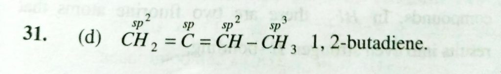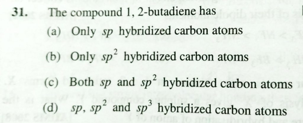 The compound 1, 2 – butadience has (a) only sp hybridized carbon atoms (b) only sp^2 hybridized carbon atoms (c) Both sp and sp^2 hybridized carbon atoms (d) sp , sp^2 and sp^3 hybridized carbon atoms 2 - butadience has (a) only sp hybridized carbon atoms (b) only sp^2 hybridized carbon atoms (c) Both sp and sp^2 hybridized carbon atoms (d) sp sp^2 and sp^3 hybridized carbon atoms The compound 1 December 9, 2020 Category: Uncategorised (JEE Advanced Physics by BM Sharma + GMP Solutions) , Facebook Messenger WhatsApp Share this:TwitterFacebook Related