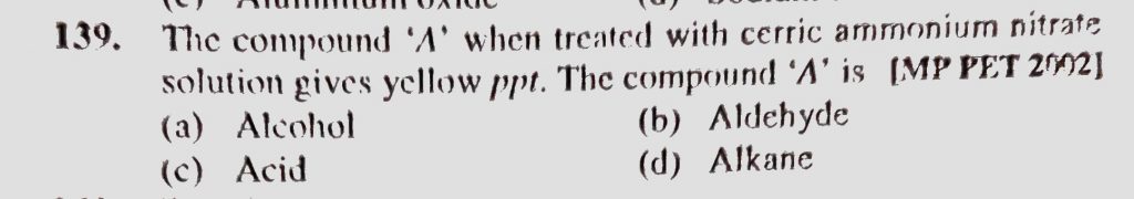 The compound ‘A’ when treated with cerric ammonium nitrate solution gives yellow ppt. The compund ‘A’ is (a) Alcohol (b) Aldehyde (c) Acid (d) Alkane The compound 'A' when treated with cerric ammonium nitrate solution gives yellow ppt. The compund 'A' is (a) Alcohol (b) Aldehyde (c) Acid (d) Alkane February 14, 2021 Category: Uncategorised (JEE Advanced Physics by BM Sharma + GMP Solutions) , Facebook Messenger WhatsApp Share this:TwitterFacebook Related
