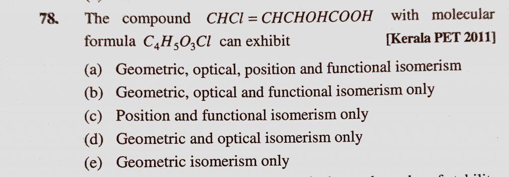 The compound CHCl = CHCHOHCOOH with molecular formula C4H5O3Cl can exhibit (a) Geometric, optical , position and functional isomerism optical position and functional isomerism The compound CHCl = CHCHOHCOOH with molecular formula C4H5O3Cl can exhibit (a) Geometric December 10, 2020 Category: Uncategorised (JEE Advanced Physics by BM Sharma + GMP Solutions) , Facebook Messenger WhatsApp Share this:TwitterFacebook Related