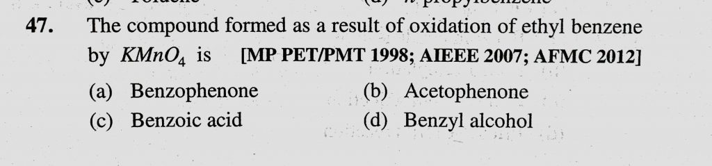 The compound formed as a result of oxidation of ethyl benzene by KMnO4 is (a) Benzophenone (b) Acetophenone (c) Benzoic acid (d) Benzyl alcohol The compound formed as a result of oxidation of ethyl benzene by KMnO4 is (a) Benzophenone (b) Acetophenone (c) Benzoic acid (d) Benzyl alcohol December 15, 2020 Category: Uncategorised (JEE Advanced Physics by BM Sharma + GMP Solutions) , Facebook Messenger WhatsApp Share this:TwitterFacebook Related