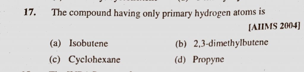 The compound having only primary hydrogen atoms is (a) Isobutene (b) 2,3-dimethylbutene 3-dimethylbutene The compound having only primary hydrogen atoms is (a) Isobutene (b) 2 December 10, 2020 Category: Uncategorised (JEE Advanced Physics by BM Sharma + GMP Solutions) , Facebook Messenger WhatsApp Share this:TwitterFacebook Related