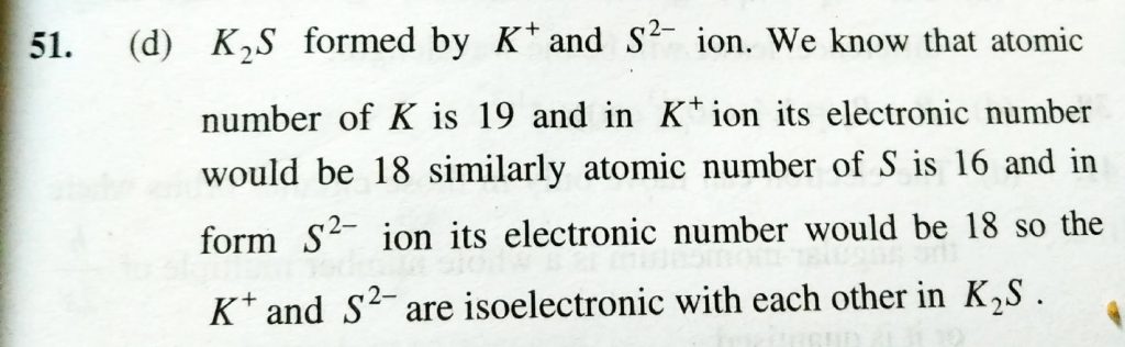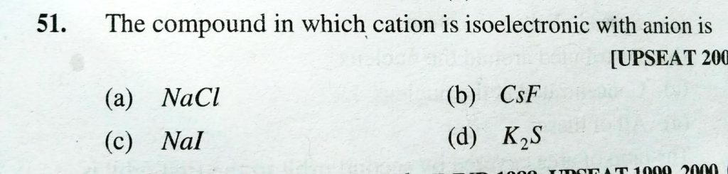 The compound in which cation is isoelectronic with anion is (a) NaCl (b) CsF (c) NaI (d) K2S The compound in which cation is isoelectronic with anion is (a) NaCl (b) CsF (c) NaI (d) K2S November 26, 2020 Category: Uncategorised (JEE Advanced Physics by BM Sharma + GMP Solutions) , Facebook Messenger WhatsApp Share this:TwitterFacebook Related