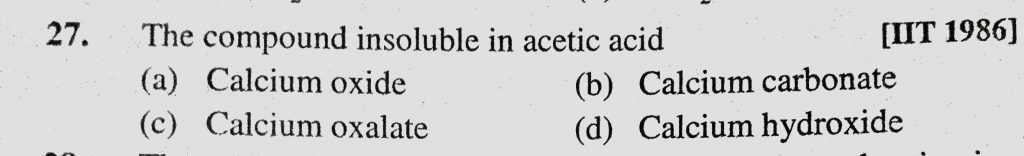 The compound insoluble in acetic acid (a) Calcium oxide (b) Calcium carbonate (c) Calcium oxalate (d) Calcium hydroxide The compound insoluble in acetic acid (a) Calcium oxide (b) Calcium carbonate (c) Calcium oxalate (d) Calcium hydroxide December 2, 2020 Category: Uncategorised (JEE Advanced Physics by BM Sharma + GMP Solutions) , Facebook Messenger WhatsApp Share this:TwitterFacebook Related