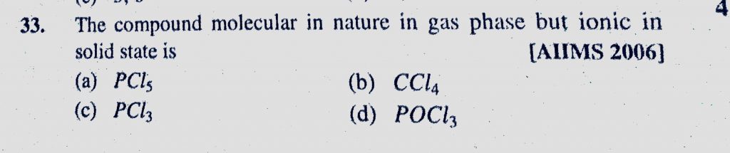 The compound molecular in nature in gas phase but ionic in solid state is (a) PCl5 (b) CCl4 (c) PCl3 (d) POCl3 The compound molecular in nature in gas phase but ionic in solid state is (a) PCl5 (b) CCl4 (c) PCl3 (d) POCl3 November 18, 2020 Category: Uncategorised (JEE Advanced Physics by BM Sharma + GMP Solutions) , Facebook Messenger WhatsApp Share this:TwitterFacebook Related