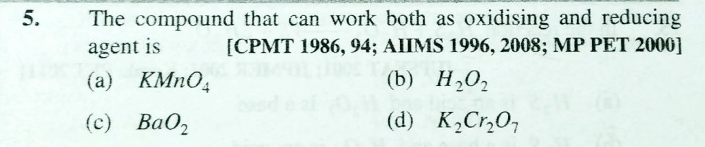 The compound that can work both as oxidising and reducing agent is (a) KMnO4 (b) H2O2 (c) BaO2 (d) K2Cr2O7 The compound that can work both as oxidising and reducing agent is (a) KMnO4 (b) H2O2 (c) BaO2 (d) K2Cr2O7 November 23, 2020 Category: Uncategorised (JEE Advanced Physics by BM Sharma + GMP Solutions) , Facebook Messenger WhatsApp Share this:TwitterFacebook Related