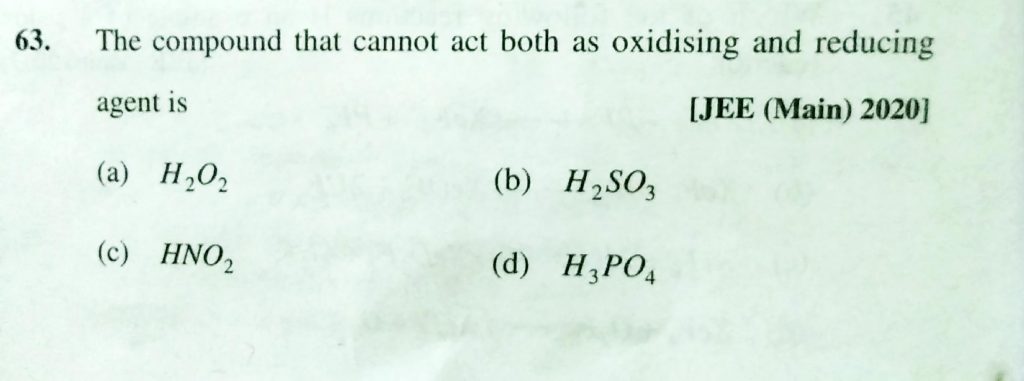 The compound that cannot act both as oxidising and reducing agent is The compound that cannot act both as oxidising and reducing agent is November 25, 2020 Category: Uncategorised (JEE Advanced Physics by BM Sharma + GMP Solutions) , Facebook Messenger WhatsApp Share this:TwitterFacebook Related