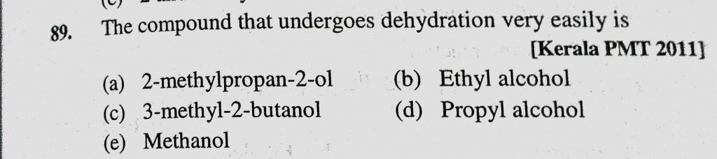 The compound that undergoes dehydration very easily is (a) 2-methylpropan-2-ol (b) Ethyl alcohol (c) 3-methyl -2-butnol (d) Propyl alcohol (e) Methanol The compound that undergoes dehydration very easily is (a) 2-methylpropan-2-ol (b) Ethyl alcohol (c) 3-methyl -2-butnol (d) Propyl alcohol (e) Methanol February 11, 2021 Category: Uncategorised (JEE Advanced Physics by BM Sharma + GMP Solutions) , Facebook Messenger WhatsApp Share this:TwitterFacebook Related