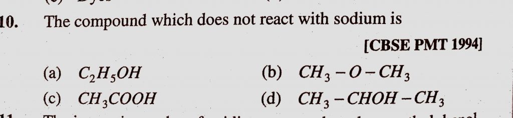 The compound which does not react with sodium is (a) C2H5OH (b) CH3 – O – CH3 (c) CH3COOH (d) CH3 – CHOH – CH3 The compound which does not react with sodium is (a) C2H5OH (b) CH3 - O - CH3 (c) CH3COOH (d) CH3 - CHOH - CH3 February 10, 2021 Category: Uncategorised (JEE Advanced Physics by BM Sharma + GMP Solutions) , Facebook Messenger WhatsApp Share this:TwitterFacebook Related