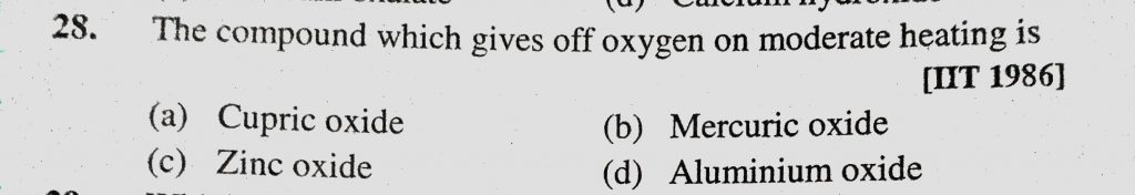 The compound which gives off oxygen on moderate heating is (a) Cupric oxide (b) Mercuric oxide (c) Zinc oxide (d) Aluminium oxide The compound which gives off oxygen on moderate heating is (a) Cupric oxide (b) Mercuric oxide (c) Zinc oxide (d) Aluminium oxide December 2, 2020 Category: Uncategorised (JEE Advanced Physics by BM Sharma + GMP Solutions) , Facebook Messenger WhatsApp Share this:TwitterFacebook Related