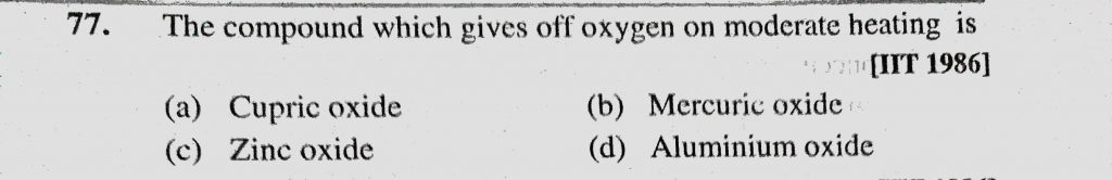 The compound which gives off oxygen on moderate heating is (a) Cupric oxide (b) Mercuric oxide (c) Zinc oxide The compound which gives off oxygen on moderate heating is (a) Cupric oxide (b) Mercuric oxide (c) Zinc oxide November 27, 2020 Category: Uncategorised (JEE Advanced Physics by BM Sharma + GMP Solutions) , Facebook Messenger WhatsApp Share this:TwitterFacebook Related
