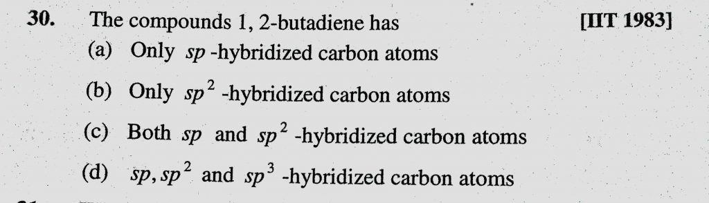 The compounds 1,2-butadiene has (a) Only sp-hybridized carbon atoms (b) Only sp2 hybidized carbon atoms (c) Both sp and sp2 hybidized carbon atoms 2-butadiene has (a) Only sp-hybridized carbon atoms (b) Only sp2 hybidized carbon atoms (c) Both sp and sp2 hybidized carbon atoms The compounds 1 December 15, 2020 Category: Uncategorised (JEE Advanced Physics by BM Sharma + GMP Solutions) , Facebook Messenger WhatsApp Share this:TwitterFacebook Related