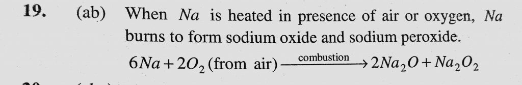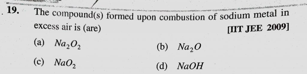 The compound(s) formed upon combustion of sodium metal in excess air is (are) (a) Na2O2 (b) Na2O (c) NaO2 (d) NaOH The compound(s) formed upon combustion of sodium metal in excess air is (are) (a) Na2O2 (b) Na2O (c) NaO2 (d) NaOH November 29, 2020 Category: Uncategorised (JEE Advanced Physics by BM Sharma + GMP Solutions) , Facebook Messenger WhatsApp Share this:TwitterFacebook Related