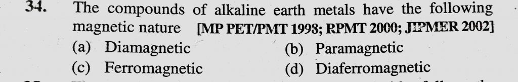 The compounds of alkaline earth metals have the following magnetic nature (a) Diamagnetic (b) Paramagnetic (c) Ferromagnetic (d) Diaferromagnetic The compounds of alkaline earth metals have the following magnetic nature (a) Diamagnetic (b) Paramagnetic (c) Ferromagnetic (d) Diaferromagnetic November 27, 2020 Category: Uncategorised (JEE Advanced Physics by BM Sharma + GMP Solutions) , Facebook Messenger WhatsApp Share this:TwitterFacebook Related