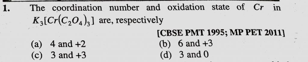 The coordination number and oxidation state of Cr in K3(Cr(C2O4)3) are, respectively (a) 4 and +2 respectively (a) 4 and +2 The coordination number and oxidation state of Cr in K3(Cr(C2O4)3) are December 5, 2020 Category: Uncategorised (JEE Advanced Physics by BM Sharma + GMP Solutions) , Facebook Messenger WhatsApp Share this:TwitterFacebook Related