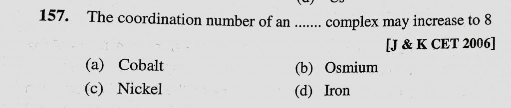 The coordination number of an ……………….. complex may increase to 8 (a) Cobalt (b) Osmium (c) Nickel (d) Iron The coordination number of an .................... complex may increase to 8 (a) Cobalt (b) Osmium (c) Nickel (d) Iron November 30, 2020 Category: Uncategorised (JEE Advanced Physics by BM Sharma + GMP Solutions) , Facebook Messenger WhatsApp Share this:TwitterFacebook Related