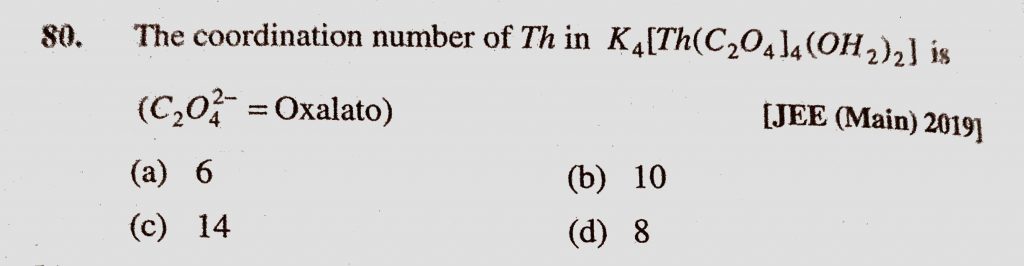 The coordination number of Th in K4(Th(C2O4)4 (OH2)2 ) is (C2O4 2- = Oxalato) (a) 6 (b) 10 The coordination number of Th in K4(Th(C2O4)4 (OH2)2 ) is (C2O4 2- = Oxalato) (a) 6 (b) 10 December 5, 2020 Category: Uncategorised (JEE Advanced Physics by BM Sharma + GMP Solutions) , Facebook Messenger WhatsApp Share this:TwitterFacebook Related