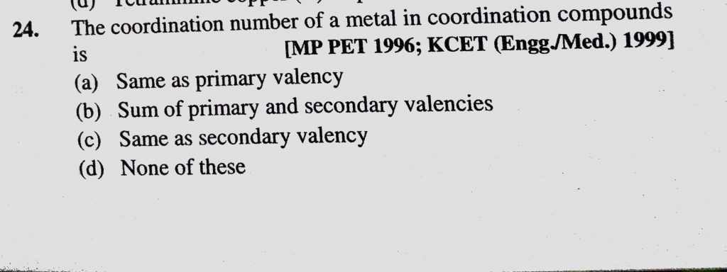 The coordination of a metal in coordination compounds is (a) Same as primary valency (b) Sum of primary and secondary valencies The coordination of a metal in coordination compounds is (a) Same as primary valency (b) Sum of primary and secondary valencies December 3, 2020 Category: Uncategorised (JEE Advanced Physics by BM Sharma + GMP Solutions) , Facebook Messenger WhatsApp Share this:TwitterFacebook Related