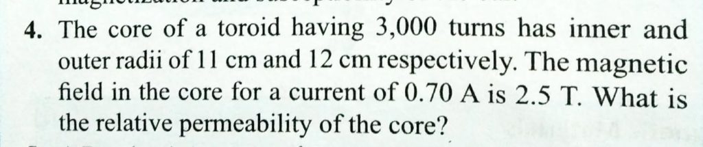 The core of a toroid having 3000 turns has inner and outer radii of 11 cm and 12 cm respectively. THe magnetic field in the core for a current of 0.70 A is 2.5 T. What is the relative permeability of the core? joining the two poles the magnetic field will be Zero ? Two like magnetic poles of strength 25 Am and 64 Am are situated 1 m apart in air. At what point on the line October 18, 2020 Category: Uncategorised (JEE Advanced Physics by BM Sharma + GMP Solutions) , Facebook Messenger WhatsApp Share this:TwitterFacebook Related