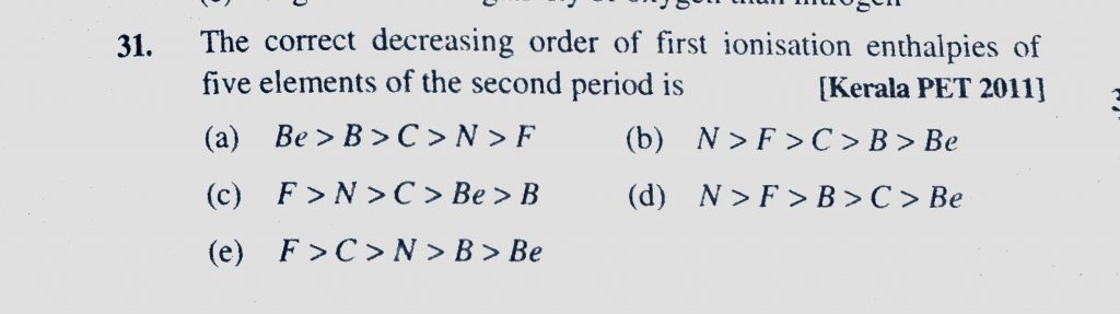 The correct decreasing order of first ionisation enthalpies of five elements of the second period is (a) Be > B > C > N > F The correct decreasing order of first ionisation enthalpies of five elements of the second period is (a) Be > B > C > N > F November 9, 2020 Category: Uncategorised (JEE Advanced Physics by BM Sharma + GMP Solutions) , Facebook Messenger WhatsApp Share this:TwitterFacebook Related
