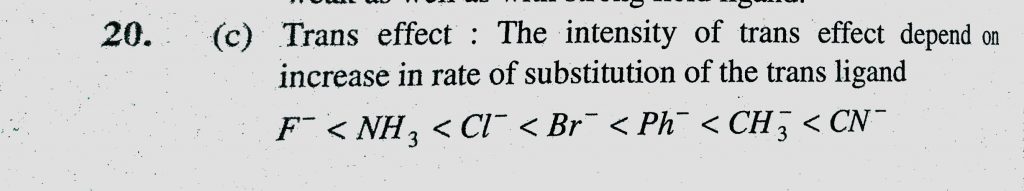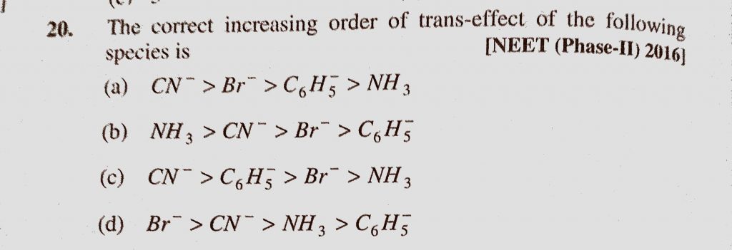 The correct increasing order of trans-effect of the following species is (a) CN- > Br- > C6H5- > NH3 The correct increasing order of trans-effect of the following species is (a) CN- > Br- > C6H5- > NH3 December 4, 2020 Category: Uncategorised (JEE Advanced Physics by BM Sharma + GMP Solutions) , Facebook Messenger WhatsApp Share this:TwitterFacebook Related