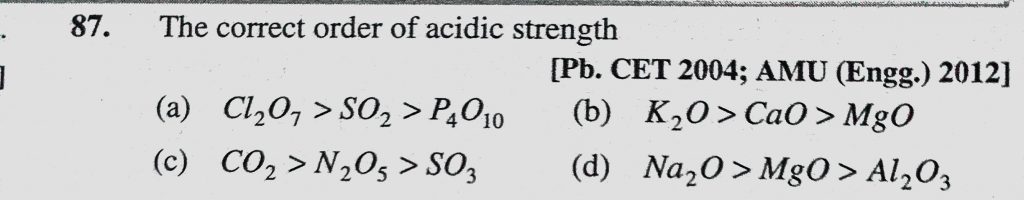 The correct order of acidic strength (a) Cl2O7 > SO2 > P4O10 (b) K2O > CaO > MgO The correct order of acidic strength (a) Cl2O7 > SO2 > P4O10 (b) K2O > CaO > MgO November 24, 2020 Category: Uncategorised (JEE Advanced Physics by BM Sharma + GMP Solutions) , Facebook Messenger WhatsApp Share this:TwitterFacebook Related