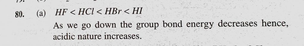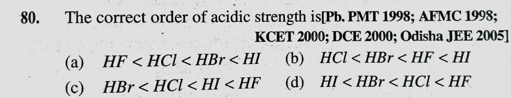 The correct order of acidic strength is (a) HF < HCl < HBr < HI (b) HCl < HBr < HF < HI The correct order of acidic strength is (a) HF < HCl < HBr < HI (b) HCl < HBr < HF < HI November 24, 2020 Category: Uncategorised (JEE Advanced Physics by BM Sharma + GMP Solutions) , Facebook Messenger WhatsApp Share this:TwitterFacebook Related