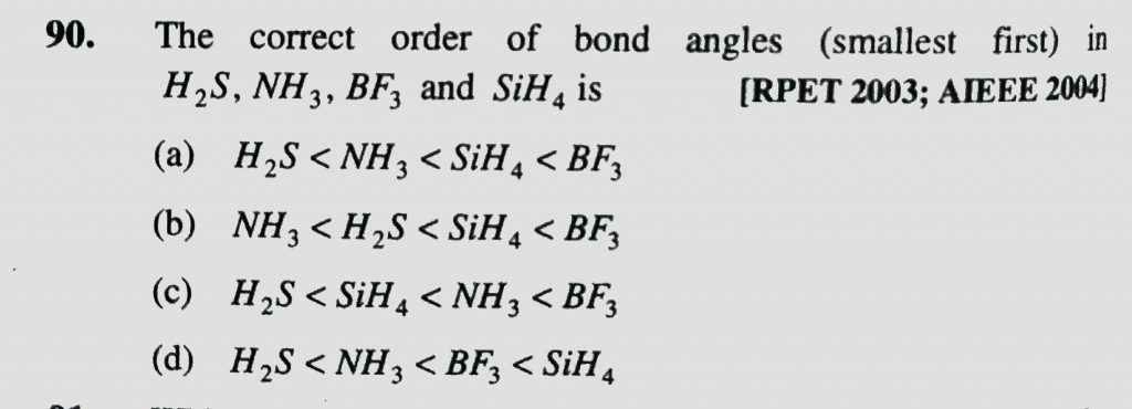 The correct order of bond angles (smallest first ) in H2S, NH3 , BF3 and SiH4 is BF3 and SiH4 is NH3 The correct order of bond angles (smallest first ) in H2S December 6, 2020 Category: Uncategorised (JEE Advanced Physics by BM Sharma + GMP Solutions) , Facebook Messenger WhatsApp Share this:TwitterFacebook Related