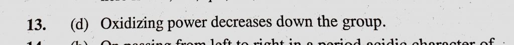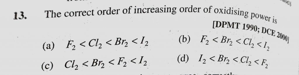 The correct order of increasing order of oxidising power is (a) F2 < Cl2 < Br2 < I2 (b) F2 < Br2 < Cl2 < I2 The correct order of increasing order of oxidising power is (a) F2 < Cl2 < Br2 < I2 (b) F2 < Br2 < Cl2 < I2 November 10, 2020 Category: Uncategorised (JEE Advanced Physics by BM Sharma + GMP Solutions) , Facebook Messenger WhatsApp Share this:TwitterFacebook Related