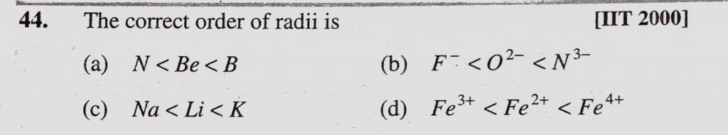The correct order of radii is (a) N < Be < B (b) F – < O 2- < N 3- (c) Na < Li < K The correct order of radii is (a) N < Be < B (b) F - < O 2- < N 3- (c) Na < Li < K November 10, 2020 Category: Uncategorised (JEE Advanced Physics by BM Sharma + GMP Solutions) , Facebook Messenger WhatsApp Share this:TwitterFacebook Related