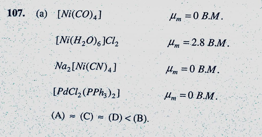 The correct order of the calculated spin-only magnetic moments of complexes (A) to (D) is (A) Ni(CO)4 (b) (Ni(H2O)6)Cl2 The correct order of the calculated spin-only magnetic moments of complexes (A) to (D) is (A) Ni(CO)4 (b) (Ni(H2O)6)Cl2 December 6, 2020 Category: Uncategorised (JEE Advanced Physics by BM Sharma + GMP Solutions) , Facebook Messenger WhatsApp Share this:TwitterFacebook Related