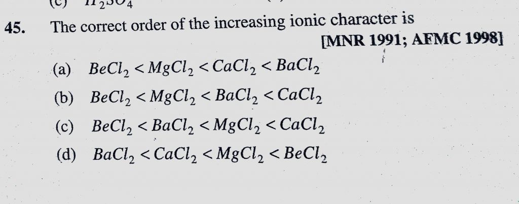 The correct order of the increasing ionic character is (a) BeCl2 < MgCl2 < CaCl2 < BaCl2 (b) BeCl2 < MgCl2 < BaCl2 < CaCl2 The correct order of the increasing ionic character is (a) BeCl2 < MgCl2 < CaCl2 < BaCl2 (b) BeCl2 < MgCl2 < BaCl2 < CaCl2 November 15, 2020 Category: Uncategorised (JEE Advanced Physics by BM Sharma + GMP Solutions) , Facebook Messenger WhatsApp Share this:TwitterFacebook Related