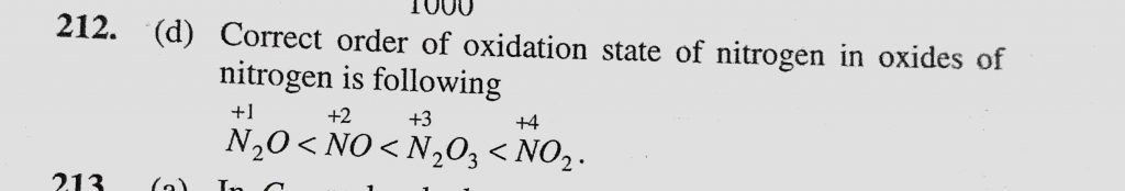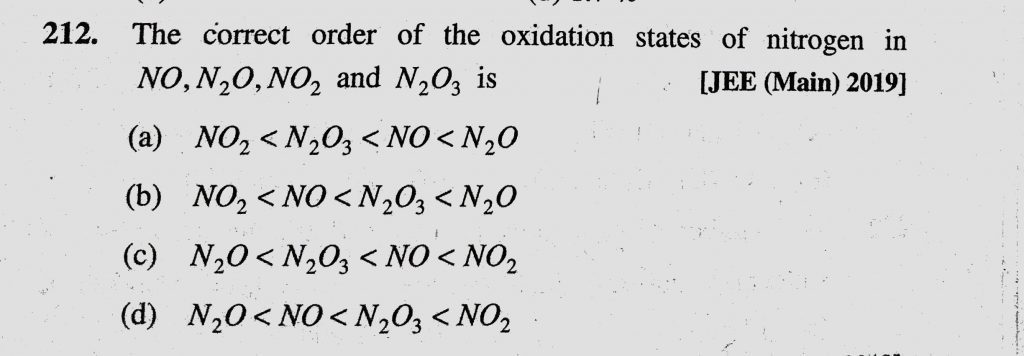 The correct order of the oxidation states of nitrogen in NO, N2O, NO2 and N2O3 is N2O NO2 and N2O3 is The correct order of the oxidation states of nitrogen in NO November 28, 2020 Category: Uncategorised (JEE Advanced Physics by BM Sharma + GMP Solutions) , Facebook Messenger WhatsApp Share this:TwitterFacebook Related