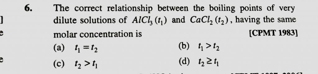 The correct relationship between the boiling points of very dilute solutions of AlCL3 ( t1) and CaCl2 ( t2) , having the same molar concentrations is having the same molar concentrations is The correct relationship between the boiling points of very dilute solutions of AlCL3 ( t1) and CaCl2 ( t2) December 14, 2020 Category: Uncategorised (JEE Advanced Physics by BM Sharma + GMP Solutions) , Facebook Messenger WhatsApp Share this:TwitterFacebook Related