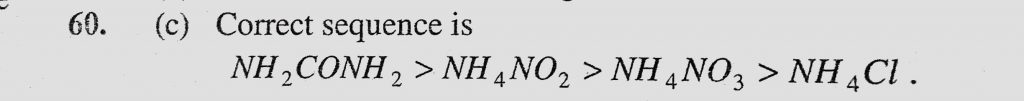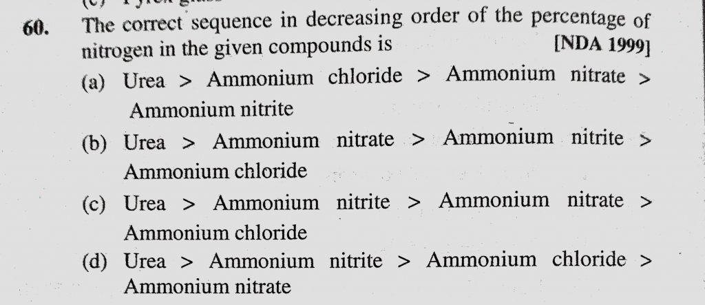 The correct sequence in decreasing order of the percentage of nitrogen in the given compounds is (a) Urea > Ammonium chloride > Ammonium nitrate > Ammonium nitrite The correct sequence in decreasing order of the percentage of nitrogen in the given compounds is (a) Urea > Ammonium chloride > Ammonium nitrate > Ammonium nitrite November 27, 2020 Category: Uncategorised (JEE Advanced Physics by BM Sharma + GMP Solutions) , Facebook Messenger WhatsApp Share this:TwitterFacebook Related