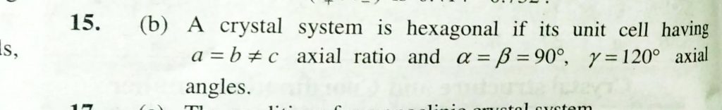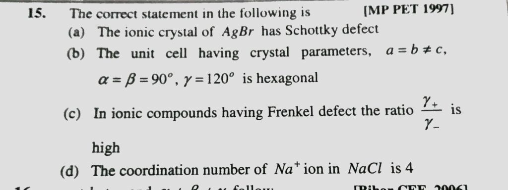 The correct statement in the following is (a) The ionic crystal of AgBr has Schottky defect (b) The unit cell having crystal parameters , a = b is not equal to c, alpha = beta = 90 degree , gama = 120 degree is hexagonal a = b is not equal to c alpha = beta = 90 degree gama = 120 degree is hexagonal The correct statement in the following is (a) The ionic crystal of AgBr has Schottky defect (b) The unit cell having crystal parameters December 16, 2020 Category: Uncategorised (JEE Advanced Physics by BM Sharma + GMP Solutions) , Facebook Messenger WhatsApp Share this:TwitterFacebook Related