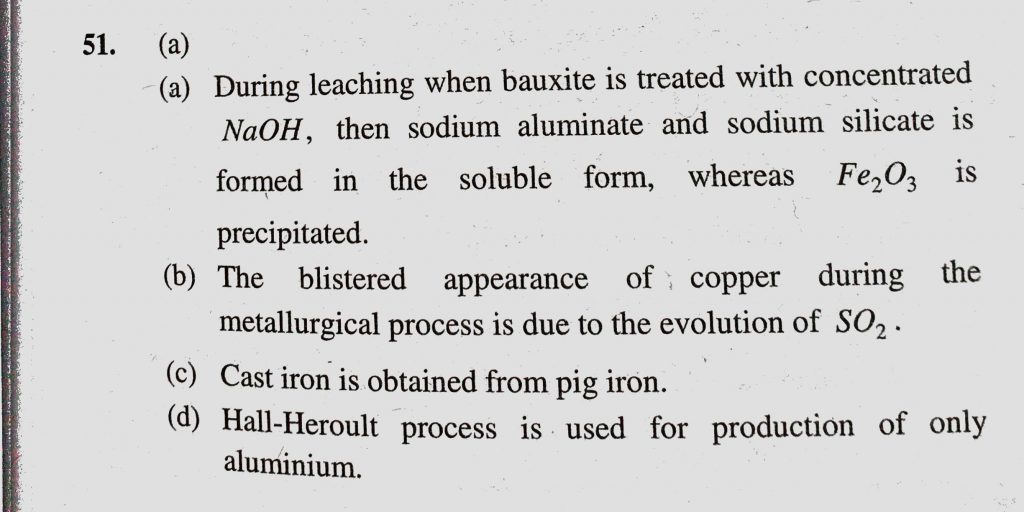 The correct statement is (a) Leaching of bauxite using concentrated NaOH solution gives sodium aluminate and sodium silicate (b) The blistered appearance of copper The correct statement is (a) Leaching of bauxite using concentrated NaOH solution gives sodium aluminate and sodium silicate (b) The blistered appearance of copper November 12, 2020 Category: Uncategorised (JEE Advanced Physics by BM Sharma + GMP Solutions) , Facebook Messenger WhatsApp Share this:TwitterFacebook Related