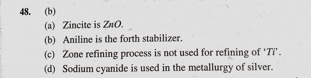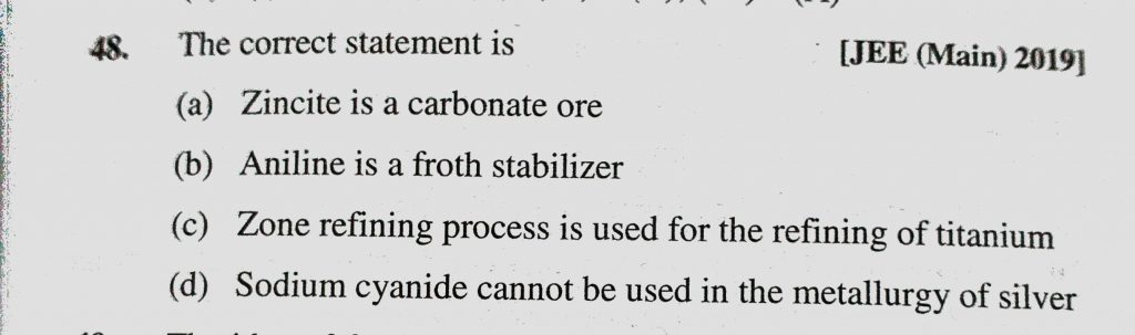 The correct statement is (a) Zincite is a carbonate ore (b) Aniline is a froth stabilizer (c) Zone refining process is used for the refining of titanium The correct statement is (a) Zincite is a carbonate ore (b) Aniline is a froth stabilizer (c) Zone refining process is used for the refining of titanium November 12, 2020 Category: Uncategorised (JEE Advanced Physics by BM Sharma + GMP Solutions) , Facebook Messenger WhatsApp Share this:TwitterFacebook Related
