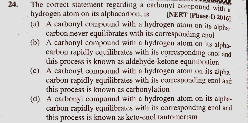 The correct statement regarding a carbonyl compound with a hydrogen atom on its alphacarbon, is (a) A carbonyl compound with a hydrogen atom on its alpha-carbon never equilibrates is (a) A carbonyl compound with a hydrogen atom on its alpha-carbon never equilibrates The correct statement regarding a carbonyl compound with a hydrogen atom on its alphacarbon December 10, 2020 Category: Uncategorised (JEE Advanced Physics by BM Sharma + GMP Solutions) , Facebook Messenger WhatsApp Share this:TwitterFacebook Related