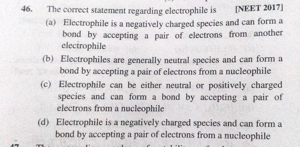 The correct statement regarding electrophile is (a) Electrophile is a negatively charged species and can form a bond by accepting a pair of electrons from another electrophile (b) Electrophiles are generally The increasing order of stability of the following free radicles is (a) (CH3)2Cn < (CH3)3 C < (C6H5)2 CH < (C6H5)3 C December 9, 2020 Category: Uncategorised (JEE Advanced Physics by BM Sharma + GMP Solutions) , Facebook Messenger WhatsApp Share this:TwitterFacebook Related
