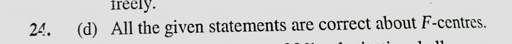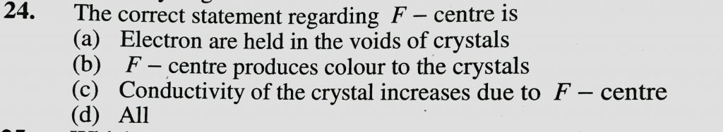 The correct statement regarding F – centre is (a) Electron are held in the voids of crystals (b) F – centre produces colour to the crystals (c) Conductivity of the crystrals increases due to F – centre (d) All Schottky defect generally appears in (a) NaCl (b) KCL (c) CsCl (d) all of these December 17, 2020 Category: Uncategorised (JEE Advanced Physics by BM Sharma + GMP Solutions) , Facebook Messenger WhatsApp Share this:TwitterFacebook Related
