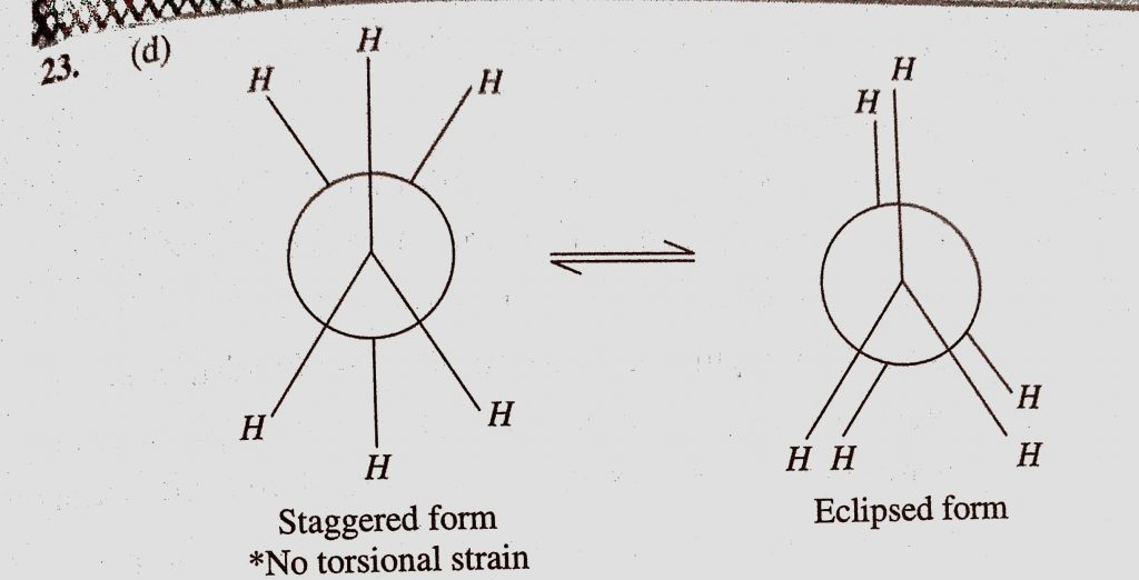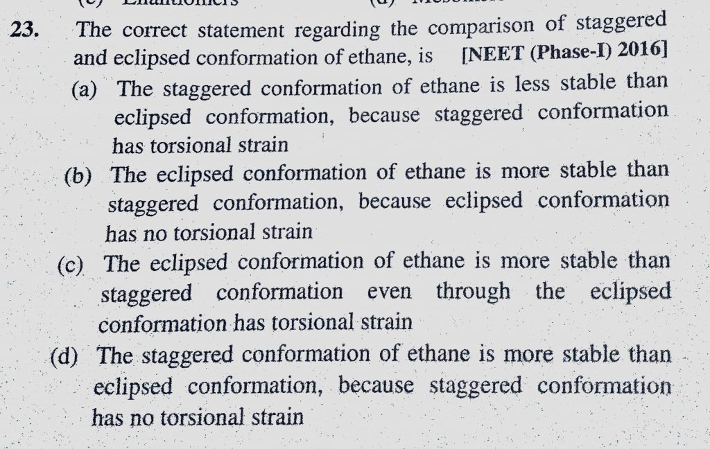 The correct statement regarding the comparison of staggered and eclipsed conformation of ethane is (a) The staggered conformation of ethane is less stable than eclipsed conformation, The correct statement regarding the comparison of staggered and eclipsed conformation of ethane is (a) The staggered conformation of ethane is less stable than eclipsed conformation December 10, 2020 Category: Uncategorised (JEE Advanced Physics by BM Sharma + GMP Solutions) , Facebook Messenger WhatsApp Share this:TwitterFacebook Related