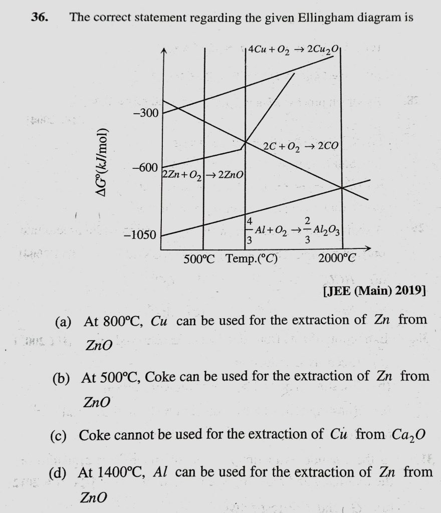 The correct statement regarding the given Ellingham diagram is (a) At 800 C, Cu can be used for the extraction of Zn from ZnO Cu can be used for the extraction of Zn from ZnO The correct statement regarding the given Ellingham diagram is (a) At 800 C November 12, 2020 Category: Uncategorised (JEE Advanced Physics by BM Sharma + GMP Solutions) , Facebook Messenger WhatsApp Share this:TwitterFacebook Related
