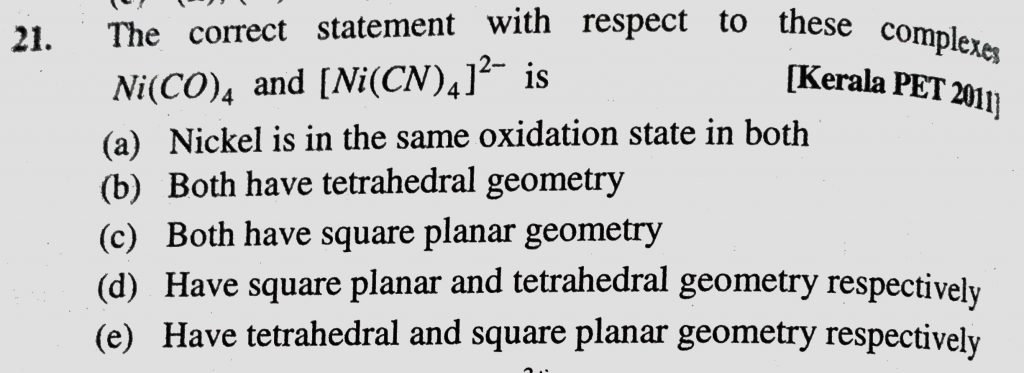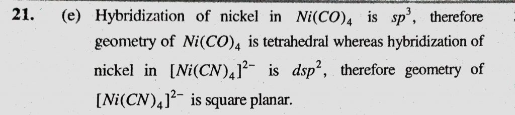 The correct statement with respect to these complexes Ni(CO)4 and (Ni(CN)4)2- is (a) Nickel is in the same oxidation state in both The correct statement with respect to these complexes Ni(CO)4 and (Ni(CN)4)2- is (a) Nickel is in the same oxidation state in both December 4, 2020 Category: Uncategorised (JEE Advanced Physics by BM Sharma + GMP Solutions) , Facebook Messenger WhatsApp Share this:TwitterFacebook Related