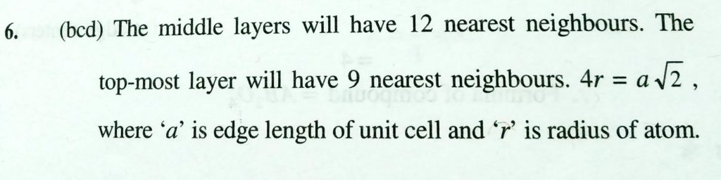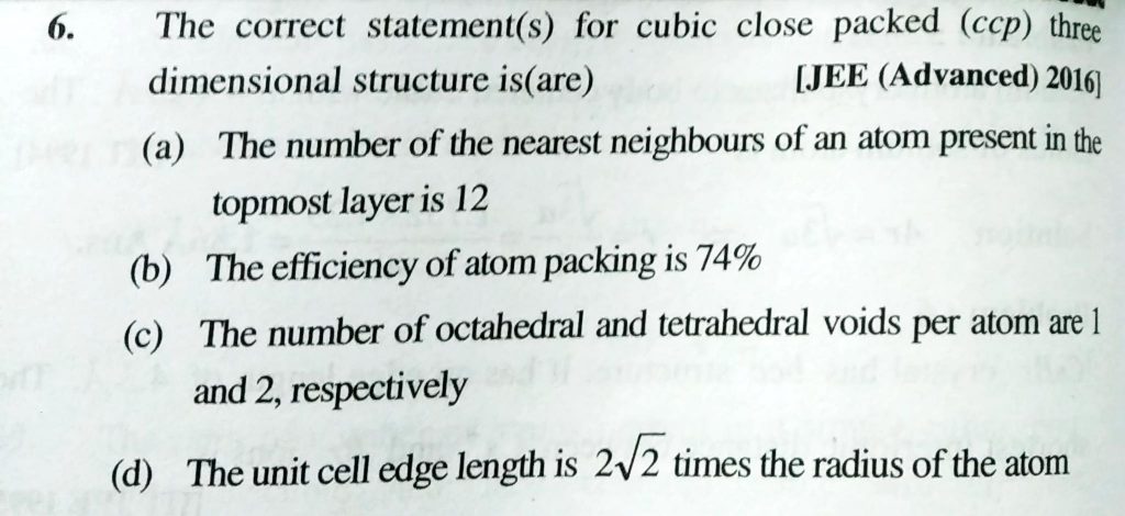 The correct statements for cubic close packed (ccp) three dimensional structure is(are ) (a) The number of the neraest neighbours of an atom present in the topmost layers is 12 (b) The efficiency of atom packing is 74% Sodium metal crystallizes in body Centedrd cubic lattice with a unit cell edge of 4.29 A. The radius of sodium atom is approximately February 10, 2021 Category: Uncategorised (JEE Advanced Physics by BM Sharma + GMP Solutions) , Facebook Messenger WhatsApp Share this:TwitterFacebook Related