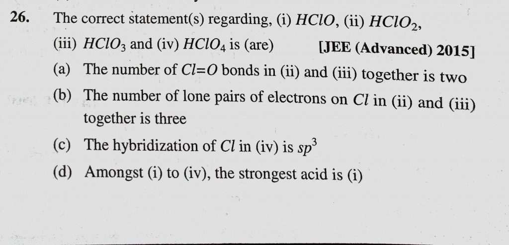 The correct statement(s) regarding (1) HClO, (2) HClO2, (3) HClO3 and (4) HClO4 is (are) (a) The number of Cl = O bonds in (2) and (3) together is two (2) HClO2 (3) HClO3 and (4) HClO4 is (are) (a) The number of Cl = O bonds in (2) and (3) together is two The correct statement(s) regarding (1) HClO November 29, 2020 Category: Uncategorised (JEE Advanced Physics by BM Sharma + GMP Solutions) , Facebook Messenger WhatsApp Share this:TwitterFacebook Related