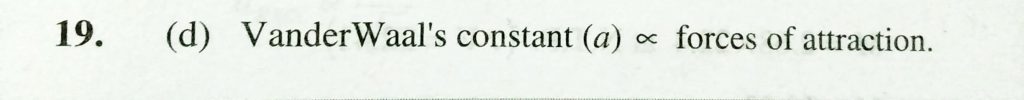 The correction factor ‘a’ to the ideal gas equation corresponds to (a) Density of teh gas molecules (b) volume of the gas molecules (c) Electric field present the gas molecules (d) forces of attraction between the gas molecules The compressibility factor for a real gas at high pressure is (a) 1 + RT/pb (b) 1 (c) 1 + pb/RT (d) 1 - pb/RT February 12, 2021 Category: Uncategorised (JEE Advanced Physics by BM Sharma + GMP Solutions) , Facebook Messenger WhatsApp Share this:TwitterFacebook Related