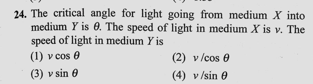 The critical angle for light going from medium X into medium Y is theta. The speed of light in medium X is v. The speed of light in medium Y is The critical angle for light going from medium X into medium Y is theta. The speed of light in medium X is v. The speed of light in medium Y is October 6, 2020 Category: Uncategorised (JEE Advanced Physics by BM Sharma + GMP Solutions) , Facebook Messenger WhatsApp Share this:TwitterFacebook Related
