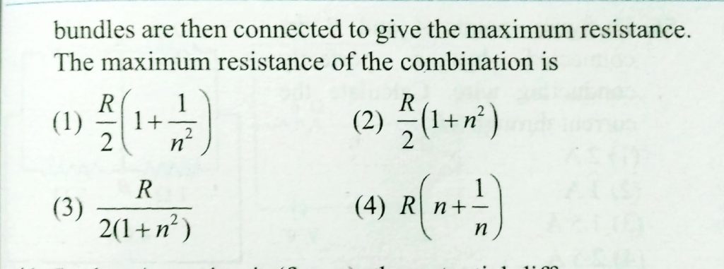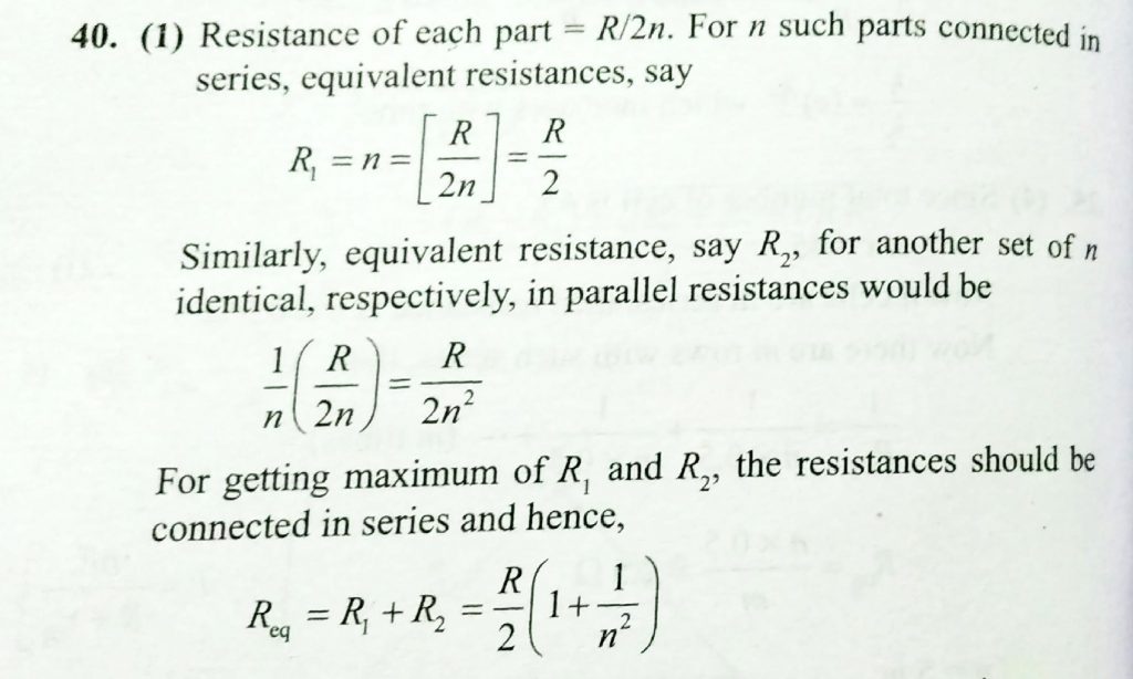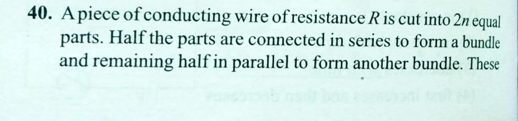 A piece of conducting wire of resistance R is cut into 2n equal parts. Half the parts are connected in series to form a bundle and remaining half in parallel to form another bundle. These bundles are then connected to give the maximum resistance. The maximum resistance of the combination is