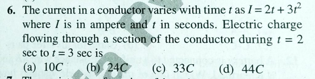 The current in conductor varies with time t as I = 2t + 3t^2 where I is in ampere and t in seconds. Electric charge flowing through a section of the conductor during t = 2 sec to t = 3 sec is The current in conductor varies with time t as I = 2t + 3t^2 where I is in ampere and t in seconds. Electric charge flowing through a section of the conductor during t = 2 sec to t = 3 sec is September 19, 2020 Category: Uncategorised (JEE Advanced Physics by BM Sharma + GMP Solutions) , Facebook Messenger WhatsApp Share this:TwitterFacebook Related